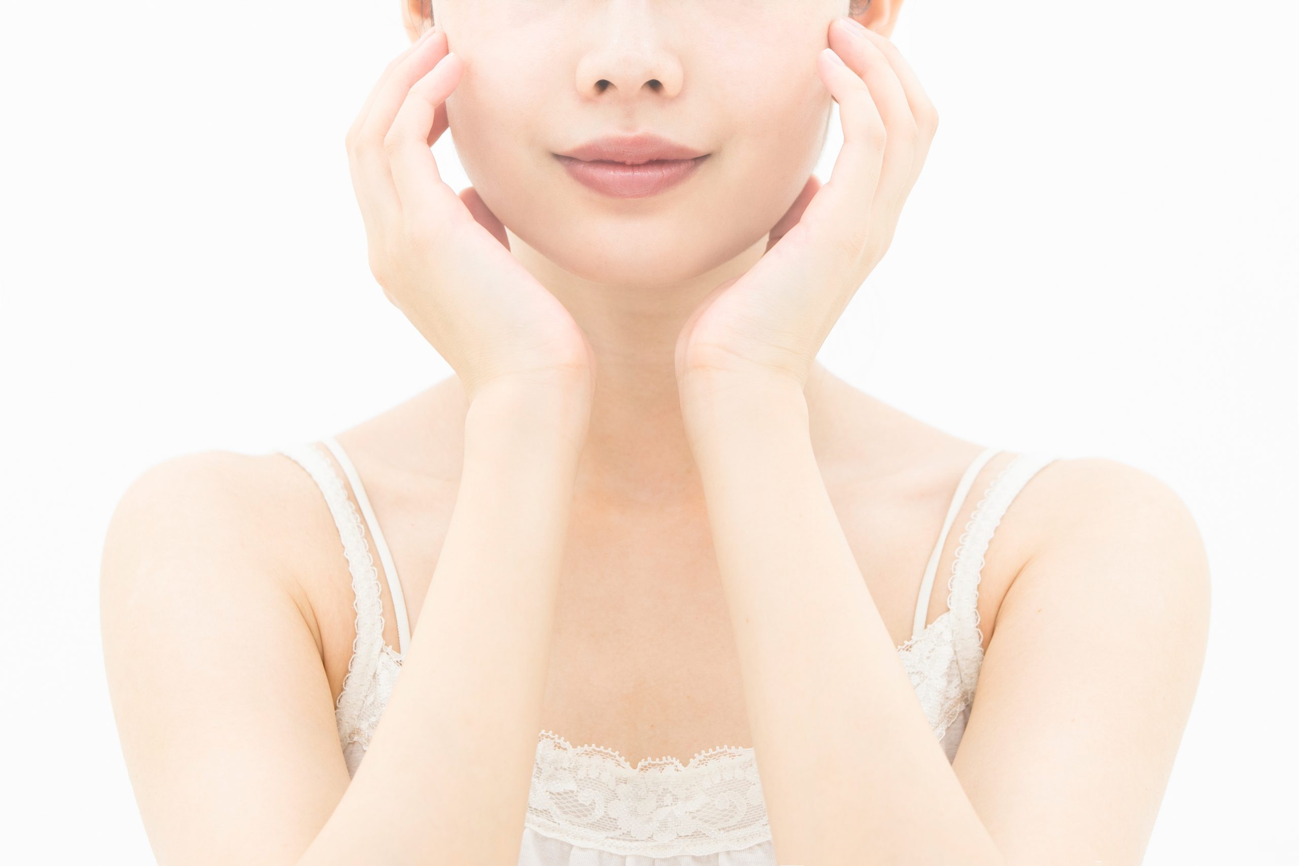 美容液をおいた場所に手をあてて、顔の内側から外側、下から上の方向にやさしく手を動かしてなじませていきます。